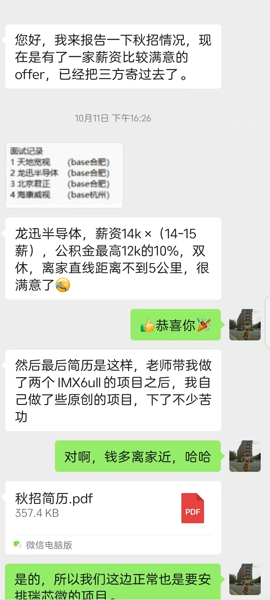 最暖心的是一对一辅导的陪伴:从帮他定制项目,到精准提供嵌入式 Linux 开发大纲、项目总结文档,再到耐心解答硬件选型这类实操难题……